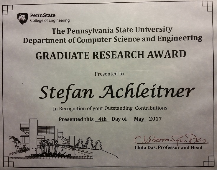 Graduate Research Award for outstanding academic contributions, by the Department of Computer Science and Engineering, Pennsylvania State University (May 2017)